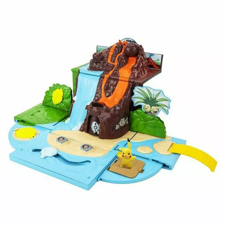 Le sac bandoulière se transforme en univers de jeu Pokémon avec un toboggan, une cascade de glace, une rivière et un ponton.