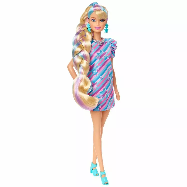 – Avec ses longs cheveux blonds (22cm) et ses 16 accessoires de coiffure, Barbie s’affiche avec allure en robe violette parsemĂ©e d’étoiles.