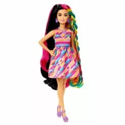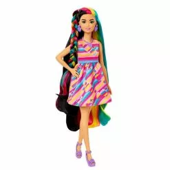 – Avec ses longs cheveux bruns (22cm) aux reflets colorĂ©s et ses 16 accessoires de coiffure, Barbie s’affiche en robe multicolore parsemĂ©e de cĹ“urs.