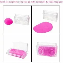 – une boîte transparente en forme de chaîne hi-fi remplie de sable magique