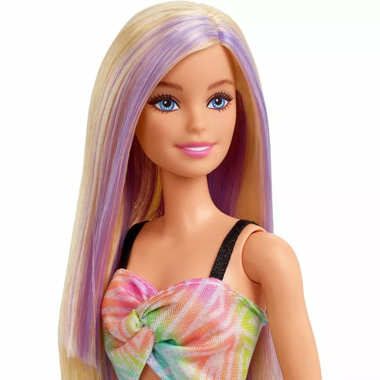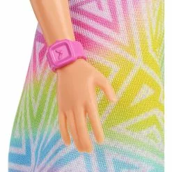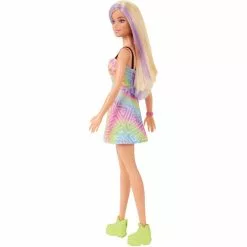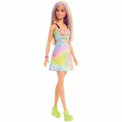 – De taille classique, cette poupée blonde avec des reflets mauve porte une robe avec des prismes couleur pastel imprimés et des chaussures vertes.