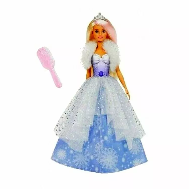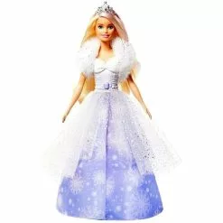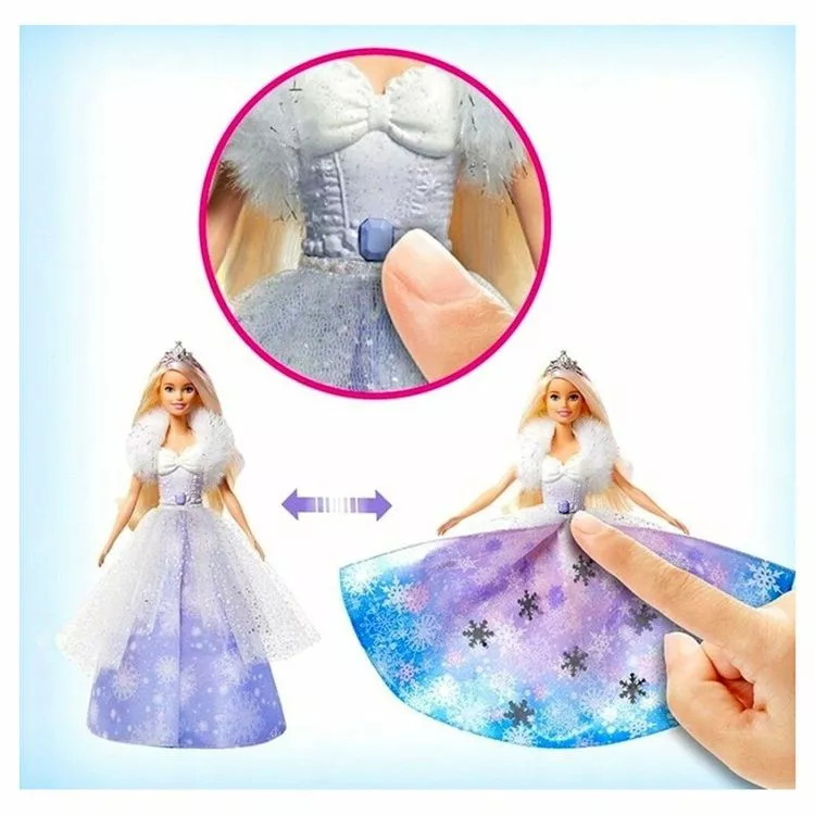 Appuyez sur le bouton du corset Barbie et la robe s’ouvrira, révélant des flocons de neige argentés et de superbes couleurs lavande, bleu et rose.