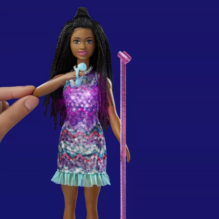 Si l’on approche le microphone de la bouche de Barbie, une musique se déclenche et la robe de la poupée s’illumine alors qu’elle se met à chanter l’une des deux chansons originales du film « Barbie : Big City, Big Dreams ».