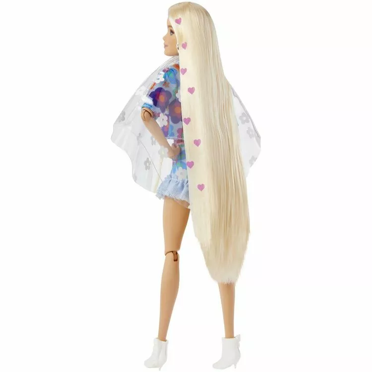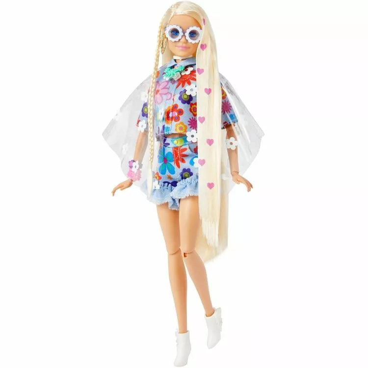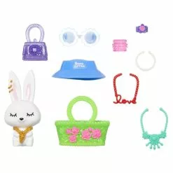 Inclut une poupée Barbie avec vêtements, chaussures et accessoires, 1 paire de lunettes de soleil, 1 sac à main et 1 figurine lapin avec chapeau et collier.