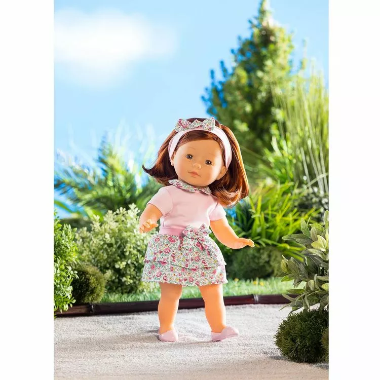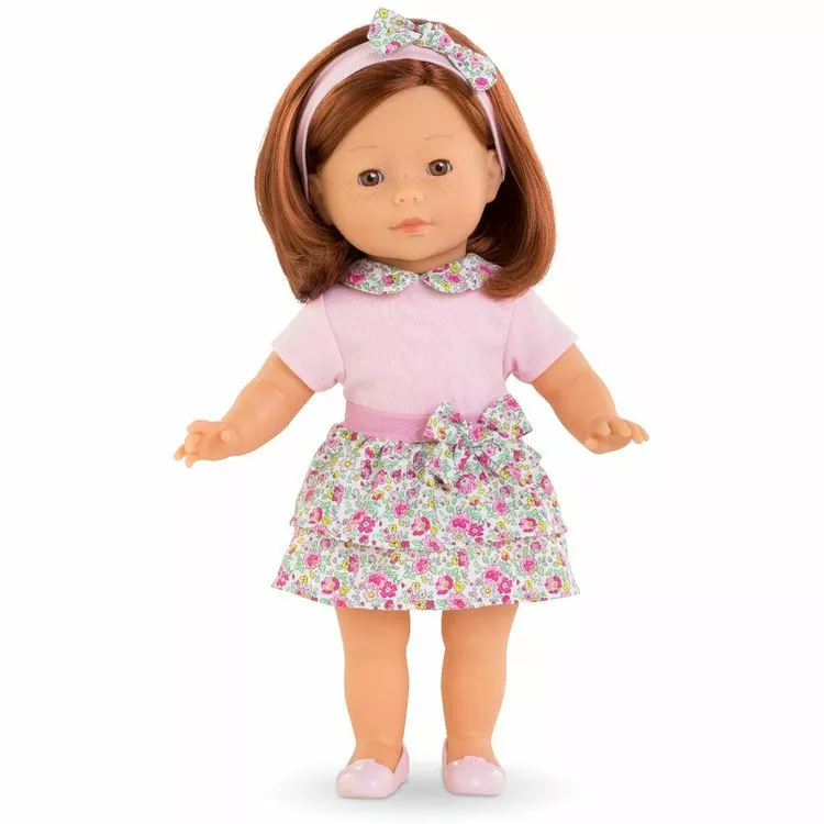 – Elle est habillée d’un t-shirt rose avec un col claudine fleuri et d’une jupe fleurie avec un noeud à la ceinture.