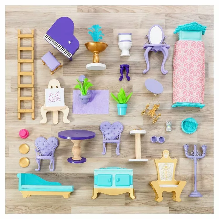 – La maison est livrée avec 30 pièces de mobilier et de jeux au total dont 3 avec lumières et sons.