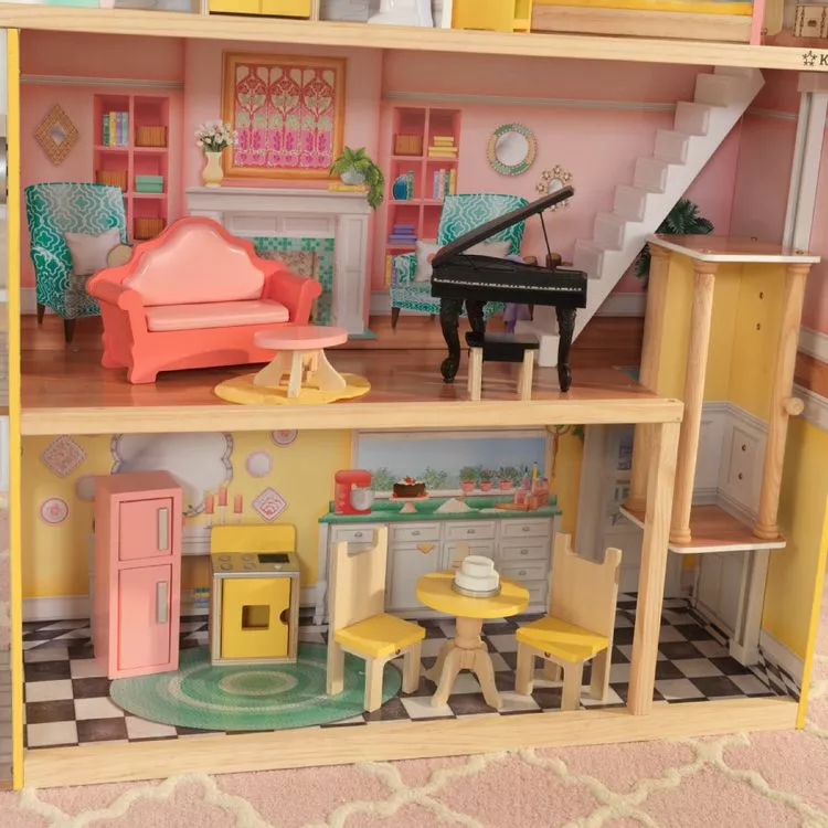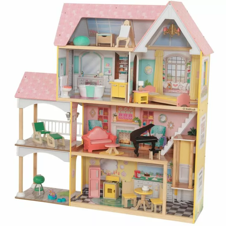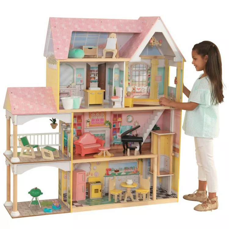 Cette maison de poupée Lola Mansion de Kidkraft comprend 4 niveaux de jeu, 6 pièces et un pack de 30 meubles et accessoires inclus.