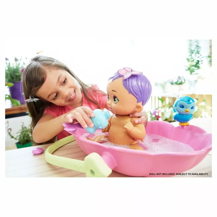 Accessoires : un oreiller, une couverture en forme d’ailes, un flacon de savon, un oiseau en plastique et des jouets de bain qui changent de couleur au contact de l’eau froide