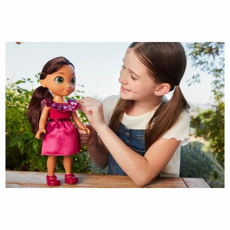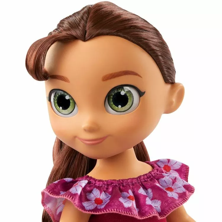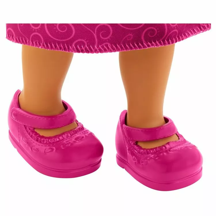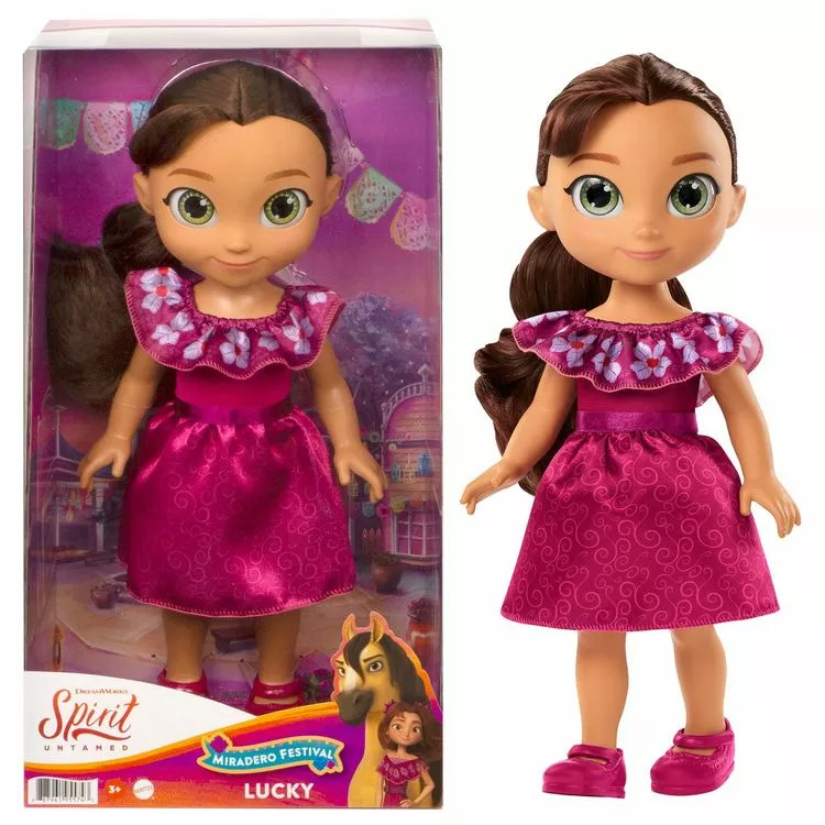 – La poupée Lucky porte une charmante robe à épaules dénudées ornée de volants et de jolies fleurs, avec un jupon à motif de tourbillon et des chaussures assorties.