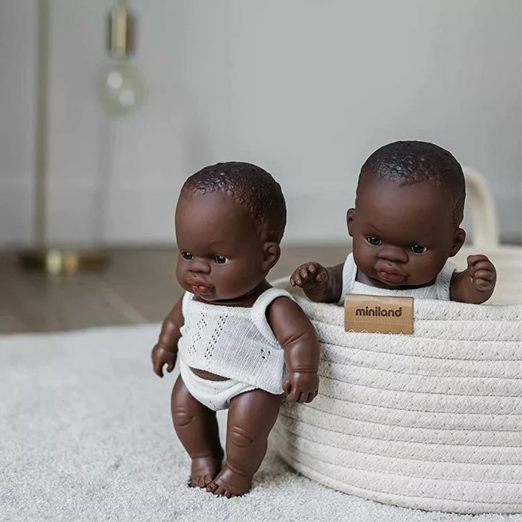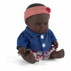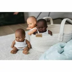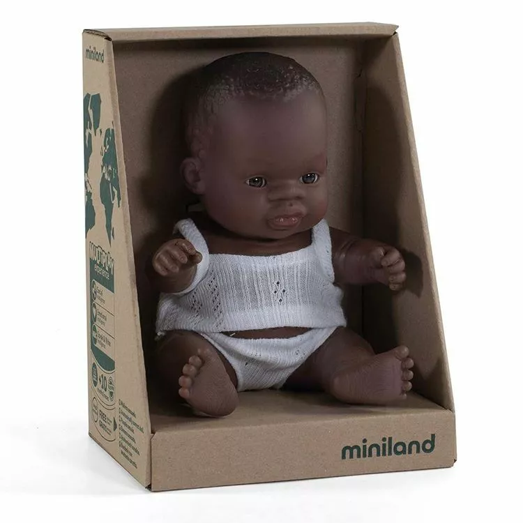 Une adorable et mignonne petitepoupée bébé africaine, de la marque Miniland, fabriquée en Espagne à la main de manière traditionnelle avec des matériaux de qualité, faites de vinyle recyclable doux et souple avec un léger parfum de vanille poursentir comme les nouveaux-nés, elle accompagne votre enfant au quotidien.