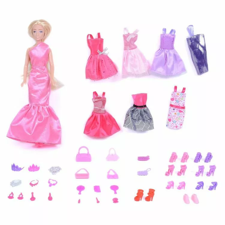 une poupée mannequin, des tenues de rechange, divers accessoires (chaussures, tiares, brosse, pochettes, miroir, parfum, collier).