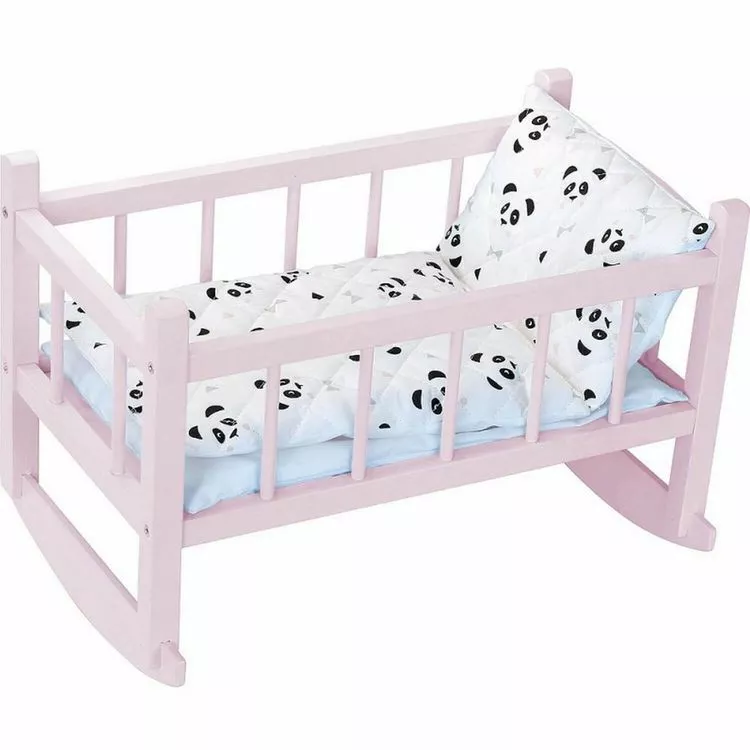 Lit bercelonnette en bois laqué rose panda de la marque Petitcollin.Convient aux poupées jusqu’à 40 cm.Couleurs : rose et blanc.Contenu :- 1 lit à bascule en hêtre massif laqué- 1 matelas- 1 oreiller- 1 couetteDimensions du lit : 41 x 24 x 28 cm. Age minimum : 3 ans