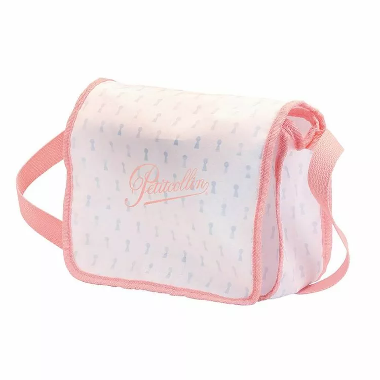 Sac à langer pour poupée contenant un biberon, une couche en tissu, une bavette, et un petit pot de talc. Age minimum : 3 ans